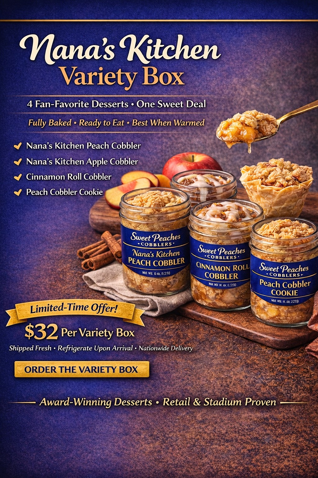 | Flavor | Nana's Kitchen Peach Cobbler, Nana's Kitchen Apple Cobbler, (Jack) Daniel's Cobbler, Peach Cobbler Rum Pound Cake, Cinnamon Roll Cobbler |